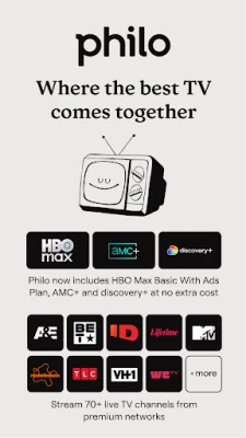 Philo's where the best TV comes together in a single subscription! Stream top networks like A&E, MTV, BET, Lifetime, Nickelodeon, & more, explore our library of 85,000+ movies and shows, watch all the AMC+ fan-favorites, and get access to endless entertainment with discovery+ and HBO Max—all with a single subscription!