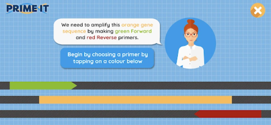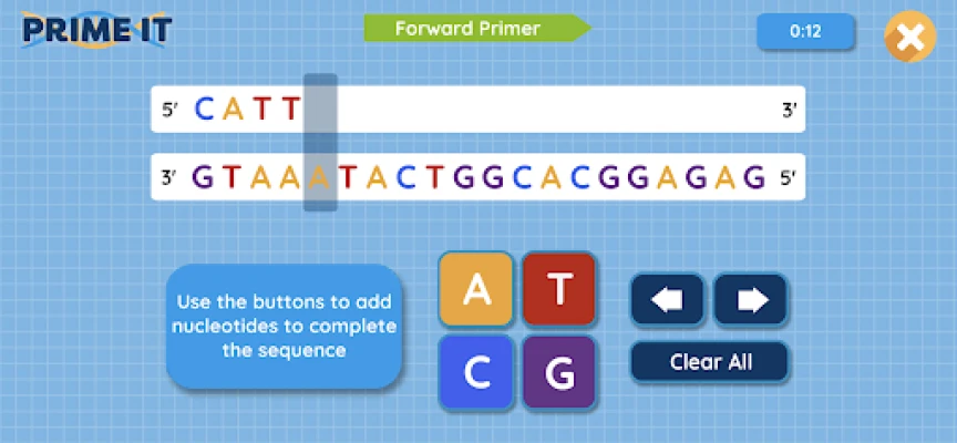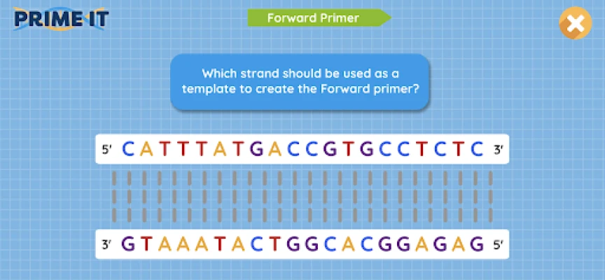 Features include: - A choice as to whether you design your forward or reverse PCR primer. - Use your knowledge of complementary base pairing to accurately design your primer. - See how quickly you can design your primers!